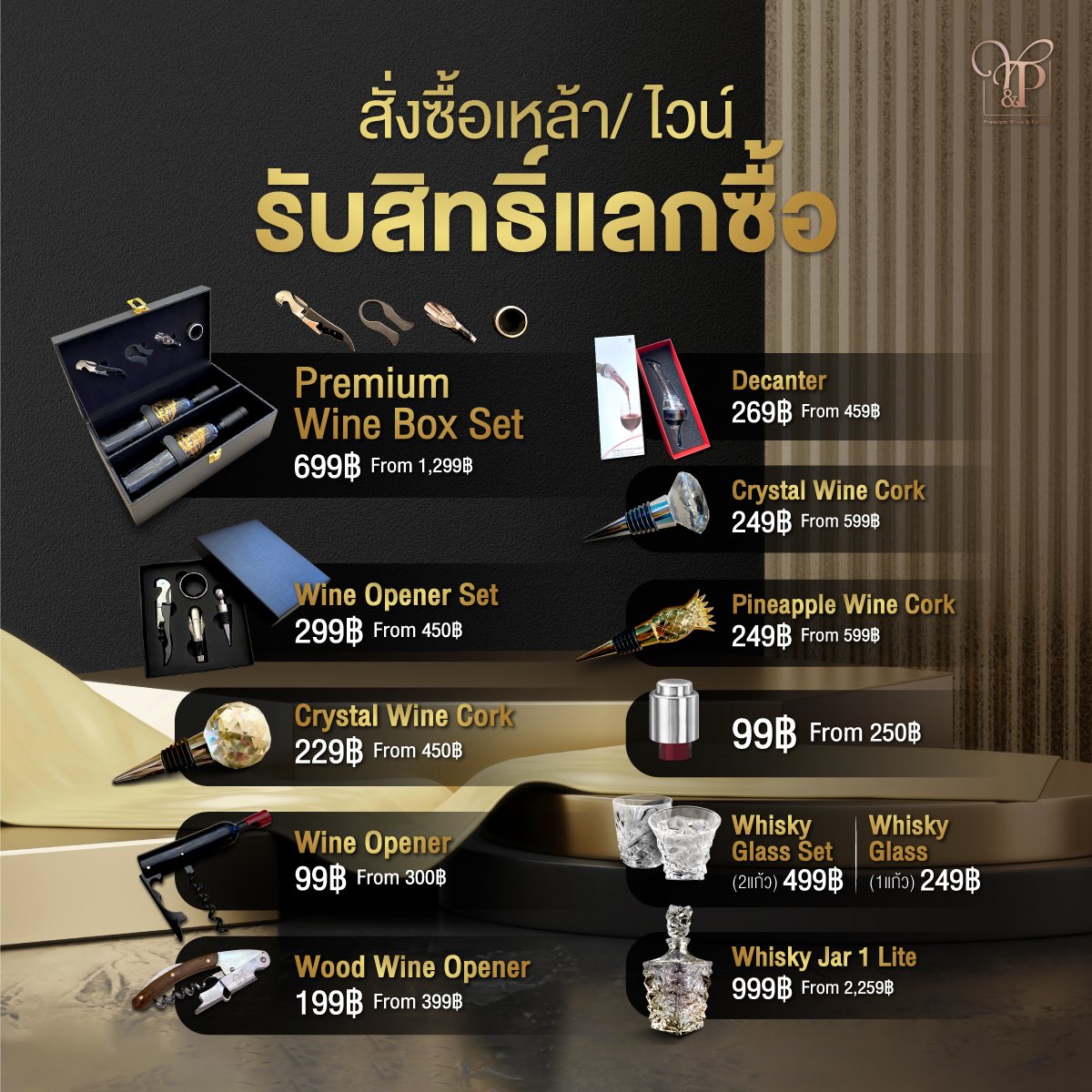 ไม่ว่าจะเป็นกล่องใส่ไวน์สุด Premium มาพร้อมอุปกรณ์เปิดขวดไวน์ครบ ✨ , Decanter ช่วยให้ไวน์หายใจ , ที่ปิดขวดไวน์สูญญากาศหัวคริสตัล ก็พร้อมให้แลกซื้อในราคาถูกเหมือนแถมฟรี