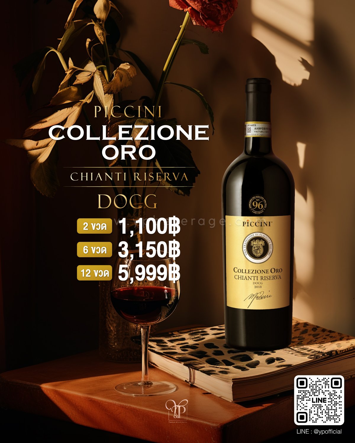 PICCINI COLLEZIONE ORO CHIANTI RESERVA DOCG สีแดงทับทิมเข้ม มีกลิ่นผลไม้แดงและกลิ่นวนิลา รสชาตินุ่มละมุน มีแทนนินปานกลางและโครงสร้างที่สมดุล จบด้วยรสชาติที่ยาวนาน เหมาะกับการจับคู่กับเนื้อวัว เนื้อแกะ เนื้อรมควัน ชีสนุ่ม และพาสต้า